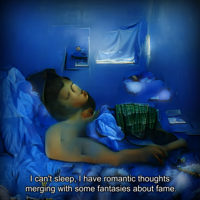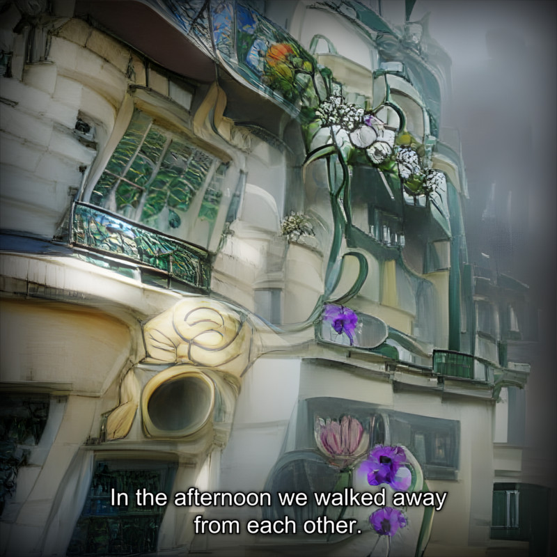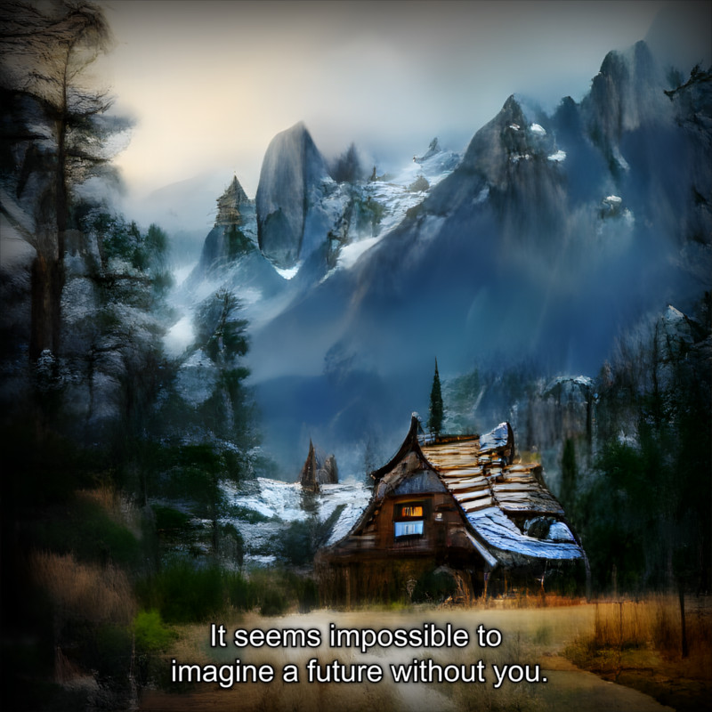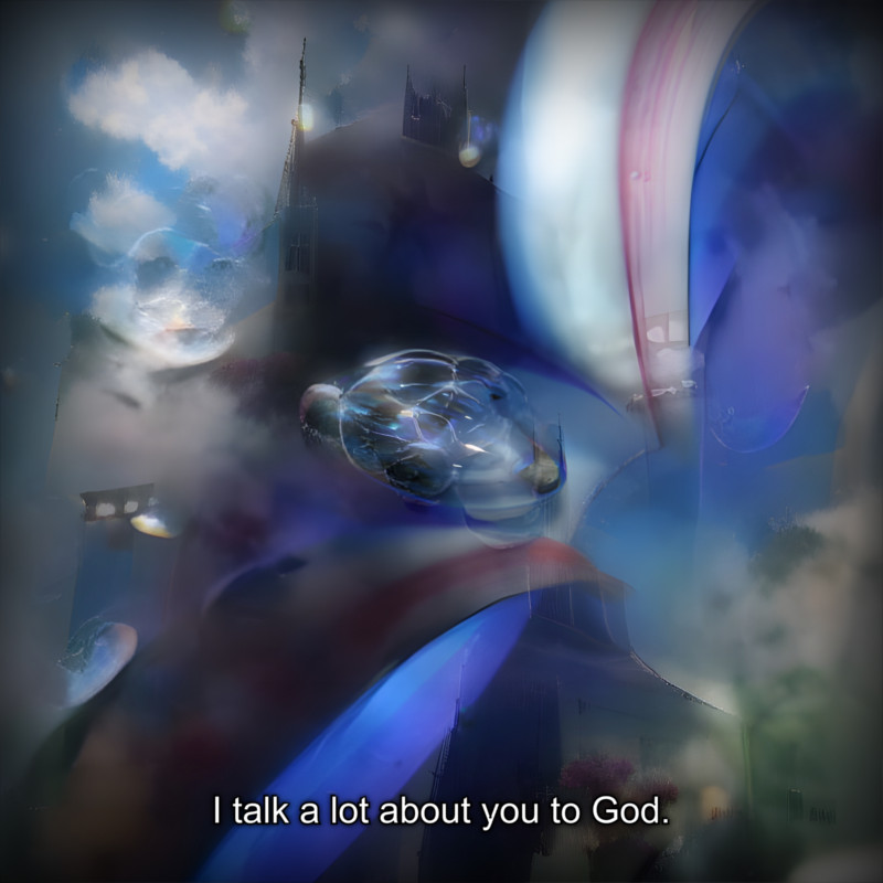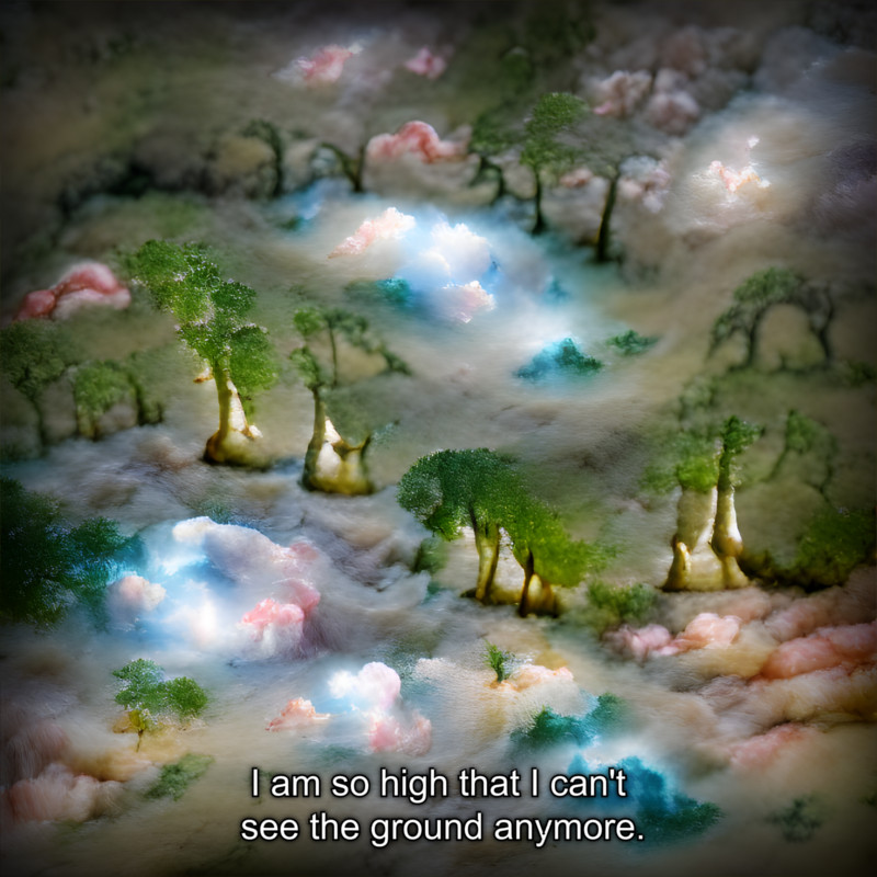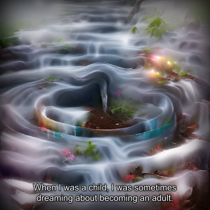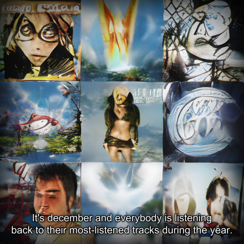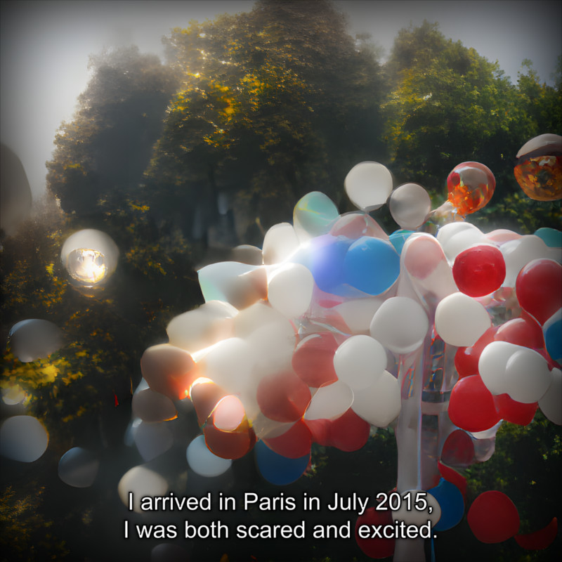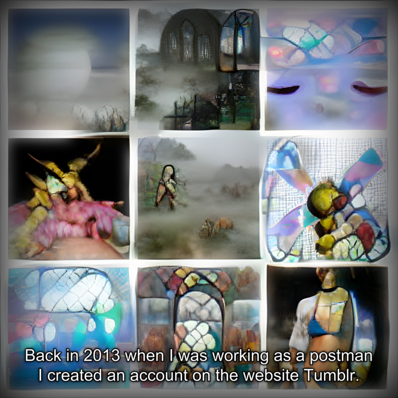 The texts are written by the artist and the pictures are created with CGI and photography combined to different AI programs including VqGAN, Dalle2 and Stable Diffusion.